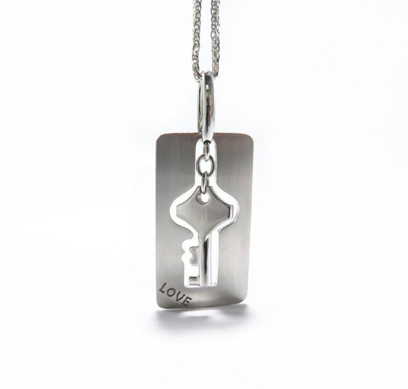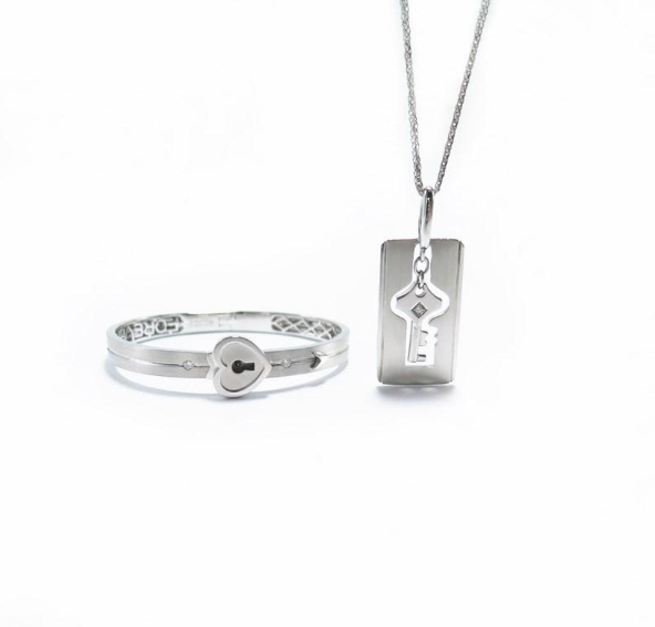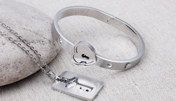 手镯跟吊坠是一套,项链另外搭配的;女士手镯全新,男士项链后面轻微使用痕迹